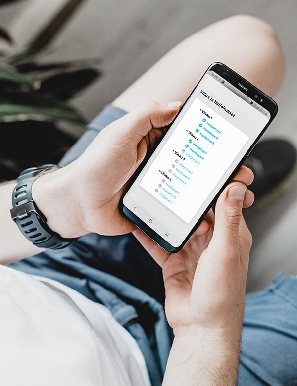 Helppokäyttöisen kurssialustamme avulla seuraat etenemistäsi ja tarkastelet tulevia treenejä. Pääset näkemään koko haasteen kaikki treenit heti ensimmäisenä haastepäivänä, joten voit suunnitella sinulle parhaat treenipäivät jo reilusti etukäteen.