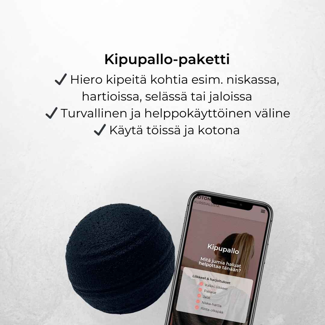 Tämä paketti sisältää laadukkaan kipupallon sekä 9 videoitua liikettä ja 4 kehonhuoltoharjoitusta, jotka opastavat sinua askel askeleelta tehokkaaseen lihashuoltoon.