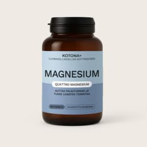 Kotona+ Quattro Magnesium vatsaystävällinen ja hyvin imeytyvä valmiste, joka sisältää neljä magnesiumin muotoa: tauraatti, malaatti, sitraatti ja merimagnesium. Yhdistelmä tukee lihasten ja hermoston normaalia toimintaa ja auttaa vähentämään väsymystä ja uupumusta.