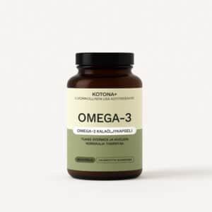 Kotona+ Omega-3 on laadukas kalaöljykapseli, joka tukee sydämen, aivojen ja näkökyvyn normaalia toimintaa. Kapselit sisältävät vahvan annoksen EPA- ja DHA-triglyseridi-muodossa, joka on mahdollisimman puhdas.
