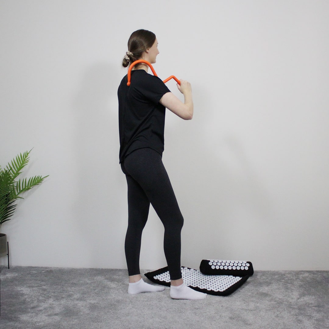 Haluatko rentoutua nopeasti ja totaalisesti? Tee näin: Avaa ensin hankalat selkäpuolen jumit hierontakoukulla ja mene sen jälkeen makoilemaan piikkimatolle ja laske pääsi piikkityynylle